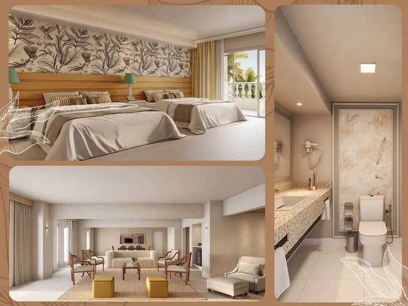 Todas as acomodações oferecem ar-condicionado, cofre digital, cortinas black-out, amenities premium e detalhes de decoração que reforçam o clima de hospedagem de luxo na Bahia.